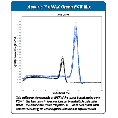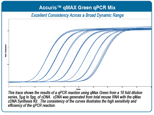 Supplied as a ready-to-use 2X master mix, qMax Green has been engineered for high sensitivity, fact cycling and excellent reproducibility. Accuris Hot Start Polymerase provides accurate PCR of a variety of templates including low copy number and difficult sequences, while the proprietary qMax Green intercalating dye exhibits higher fluorescence and lower PCR inhibition than other popular green dyes.
