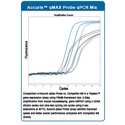 Optimized for use with TaqMan™, Scorpions® and molecular beacon probes, qMax Probe qPCR Mix is a ready-to-use formulation for real time quantitative assays. qMax Probe utilizes Accuris Hot Start Taq Polymerase or robust PCR with a variety of templates. A specially formulated buffer provides optimal conditions for both superior polymerase function and probe detection, resulting in earlier Ct values and a broad detection range. Complicated, multiplex reactions can be performed without any loss in performance or decrease in detection. The 2X mix requires little, if any optimization and can be used with both fast and standard protocols.