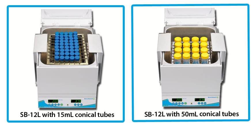 The seamless, stainless steel chamber has a 12 liter capacity and includes a universal spring-loaded platform for securing 15 & 50ml test tubes, as well as Erlenmeyer flasks and media bottles up to 1 liter. A hinged and removable lid is also included to reduce energy waste, prevent splashing and divert condensation away from samples.